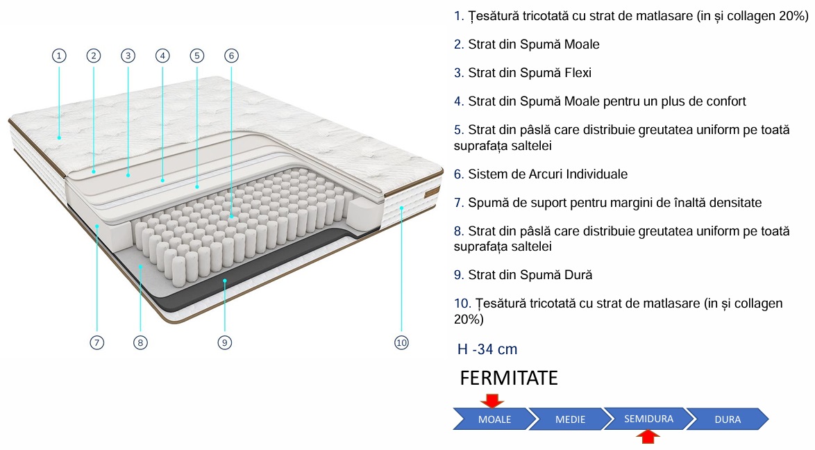 Combinarea dintre proteina de colagen, care asigură o integritate structurală țesuturilor din corpul nostru și sistemul de Arcuri Individuale vă vor oferi o experiență perfectă de somn. Acest sistem de arcuri se adaptează corpului uman și distribuie greutatea uniform pe saltea. Datorită lor confortul în somn crește, circulația sîngelui este mai bună și coloana vertebrală ia o formă mai sănătoasă în timpul somnului.
