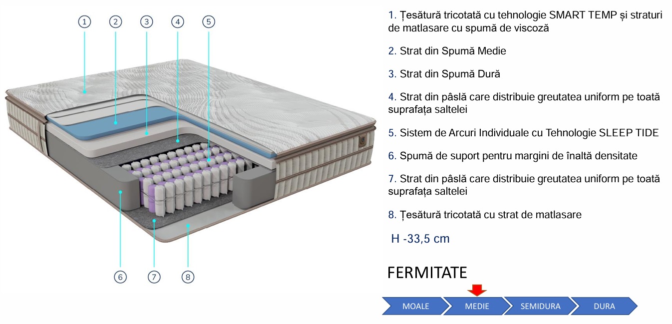 Salteaua Bella Master Sleep este pentru cei ce își doresc absolutul în materie de confort și tehnologie în dormitor. Dacă vrei o experiență de dormit la nivel de lux, cu cele mai noi inovații integrate, acest model ți se adresează direct. Este ideală pentru persoanele care nu acceptă compromisuri când vine vorba de odihnă: fie că ești un cunoscător al saltelelor premium, fie că pur și simplu vrei “ce e mai bun” pentru sănătatea somnului tău, Bella Master Sleep promite să impresioneze.