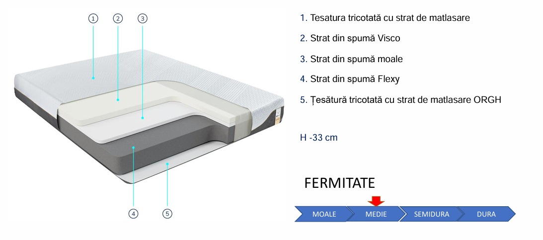 Salteaua Visco Prime este un model de saltea format din 3 straturi de spumă de cea mai înaltă calitate. Partea superioară conține un strat de visco spumă cu memorie și are o grosime de 5 cm, stratul de mijloc este format cu o spumă poliuretanică Soft de o duritate medie cu o grosime la fel de 5 cm iar partea de jos a saltele conține o spumă Flexi cu o grosime de 15 cm. Aceste straturi de spume unite împreună, oferă un somn calitativ și un suport perfect părților corpului tău. Cu un design elegant și o husă detașabilă, acesta oferă o textură fină la atingere cât și posibilitatea spălării la 30 grade Celsius.