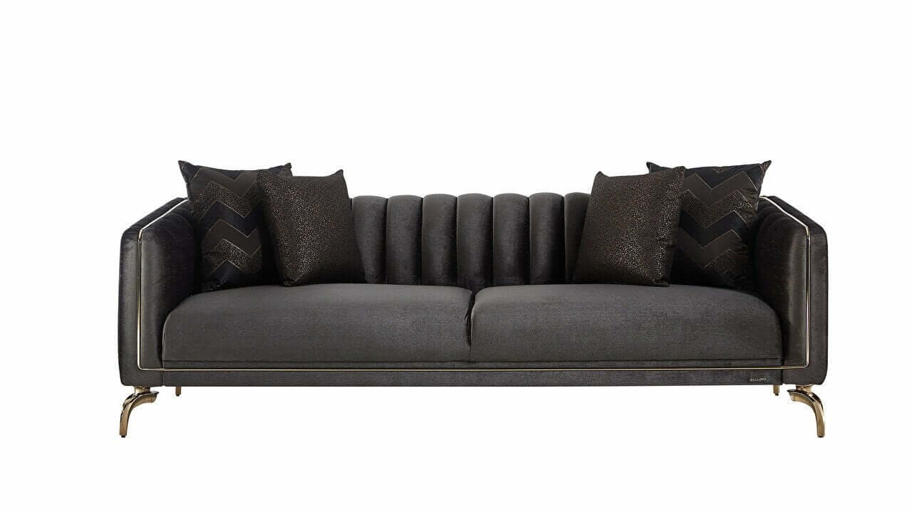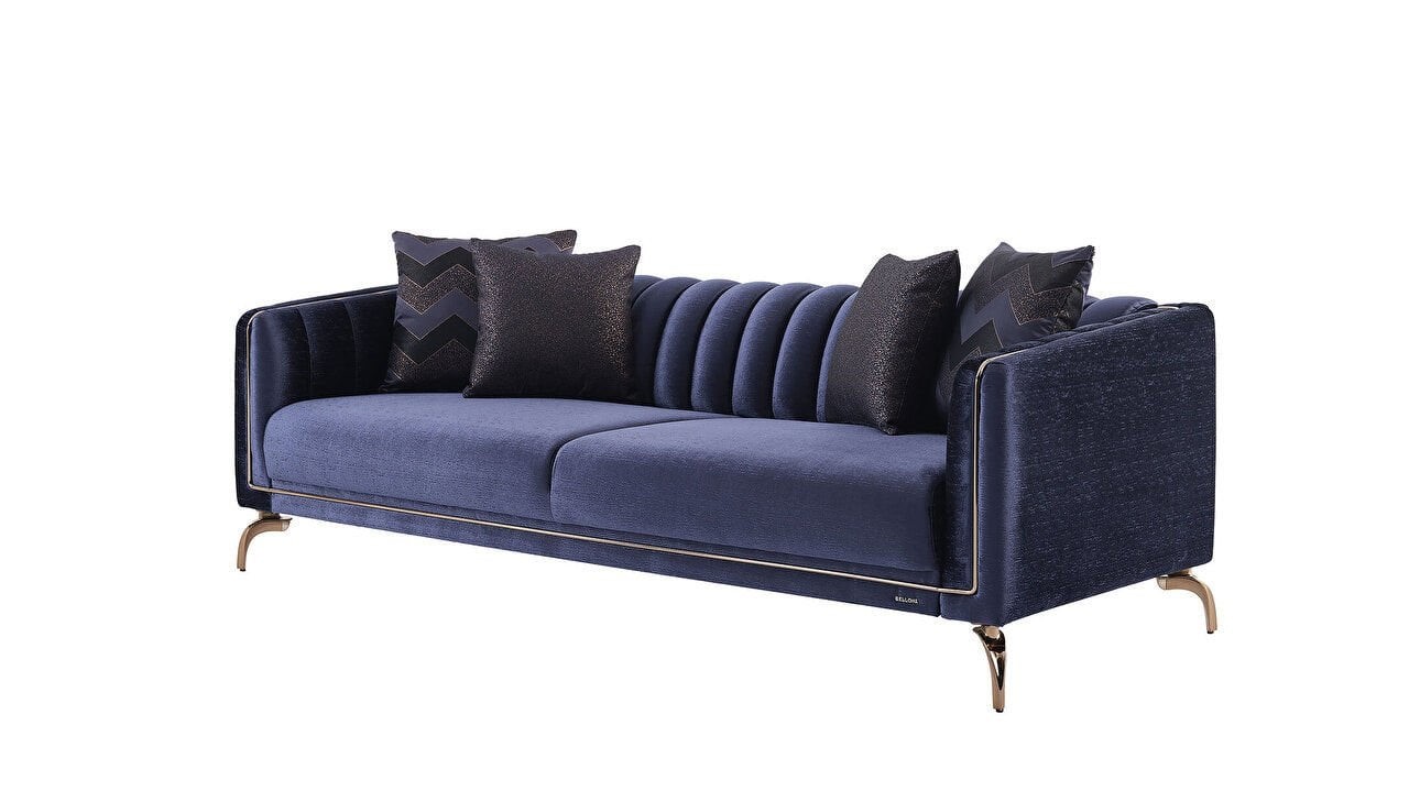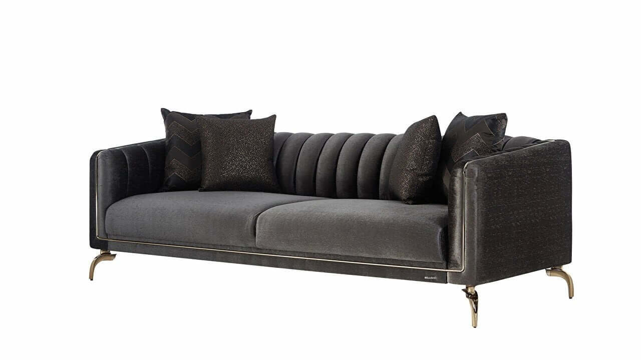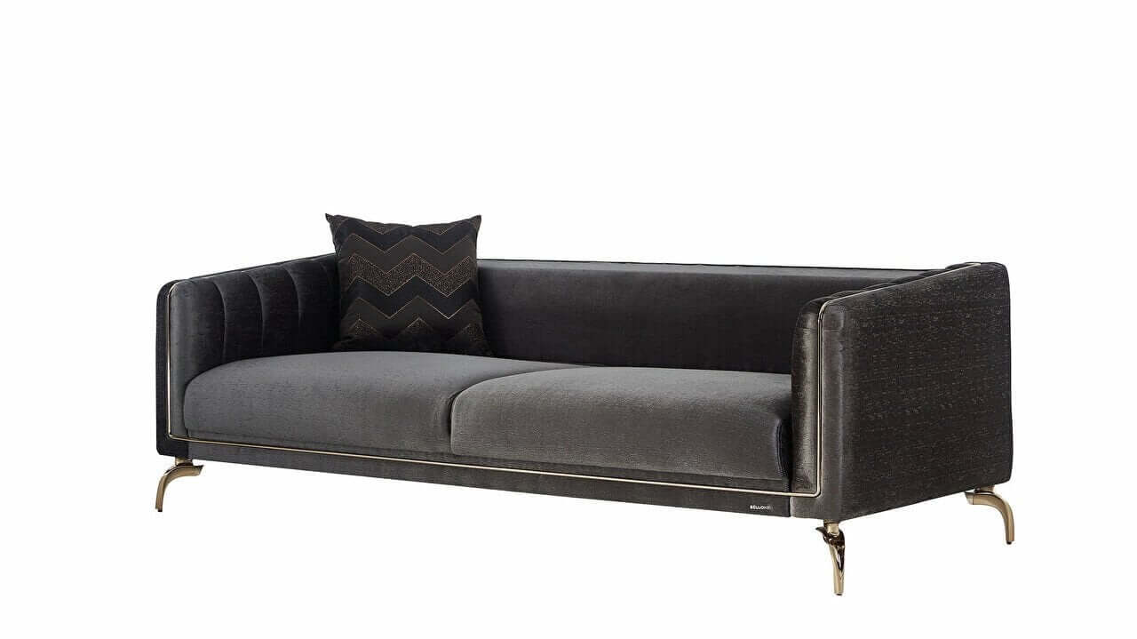 „Canapeaua Larissa de la Bellona (extensibilă)” — canapea elegantă și practică cu tapițerie moale și cusături decorative fine. Modelul combină confortul și stilul, completat de perne ornamentale și design rafinat, integrându-se armonios într-un living ce radiază căldură și estetică.