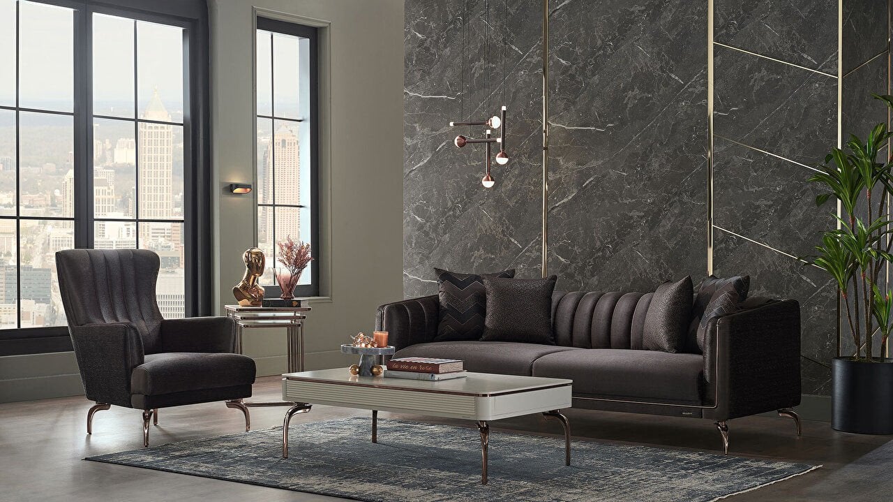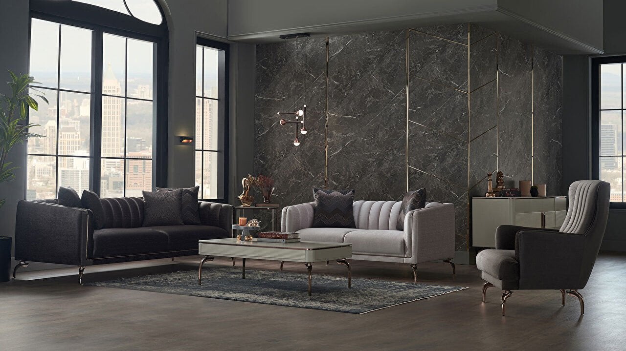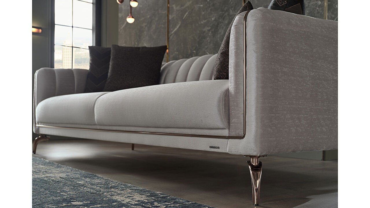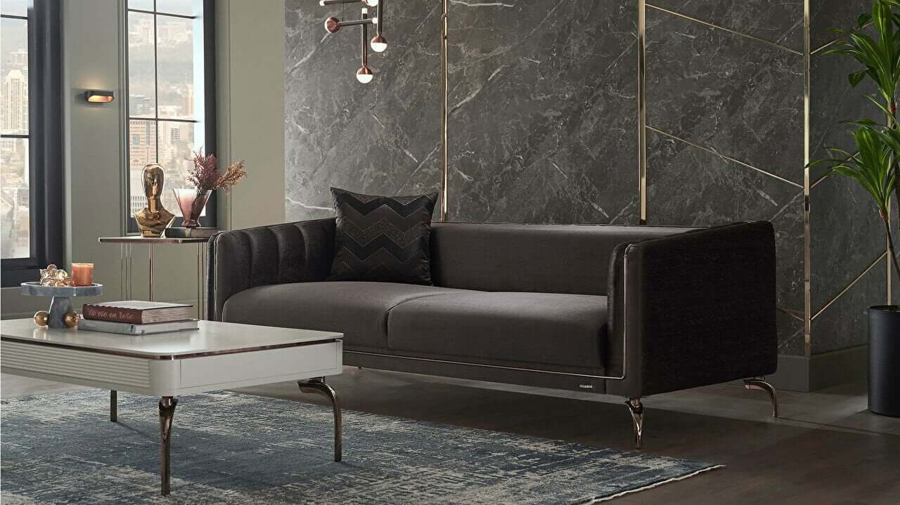 „Canapeaua Larissa de la Bellona (extensibilă)” — canapea elegantă și practică cu tapițerie moale și cusături decorative fine. Modelul combină confortul și stilul, completat de perne ornamentale și design rafinat, integrându-se armonios într-un living ce radiază căldură și estetică.