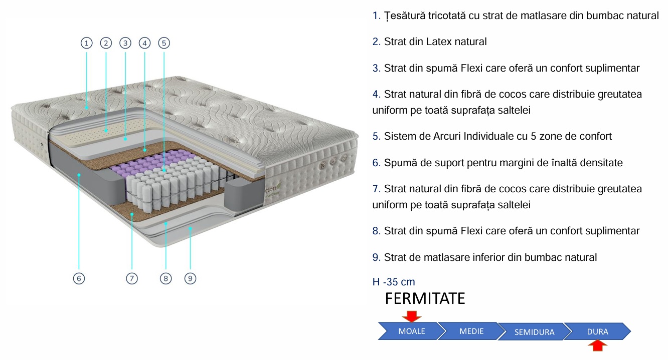 Salteaua Dream Cotton reprezintă unificarea ideilor inovatoare pentru a oferi un somn confortabil și sănătos. Tehnologia cu arcuri individuale divizate în 5 zone de confort, face ca somnul să fie unul de calitate, totodată împreună cu spuma flexi ajutând și la completarea confortului desăvârșit. Țesătura din fibre naturale de cocos distribuie uniform greutatea pe toată suprafața, protejează curbele naturale ale coloanei vertebrale în diferite poziții de dormit și creează un mediu mai confortabil. Salteaua Dream Cotton oferă două fermități diferite împreună cu suprafața sa moale și dură.