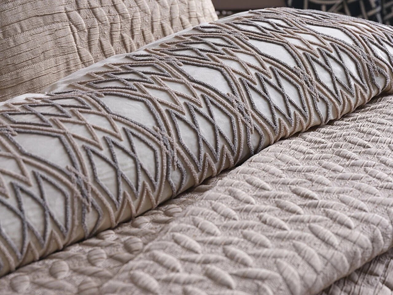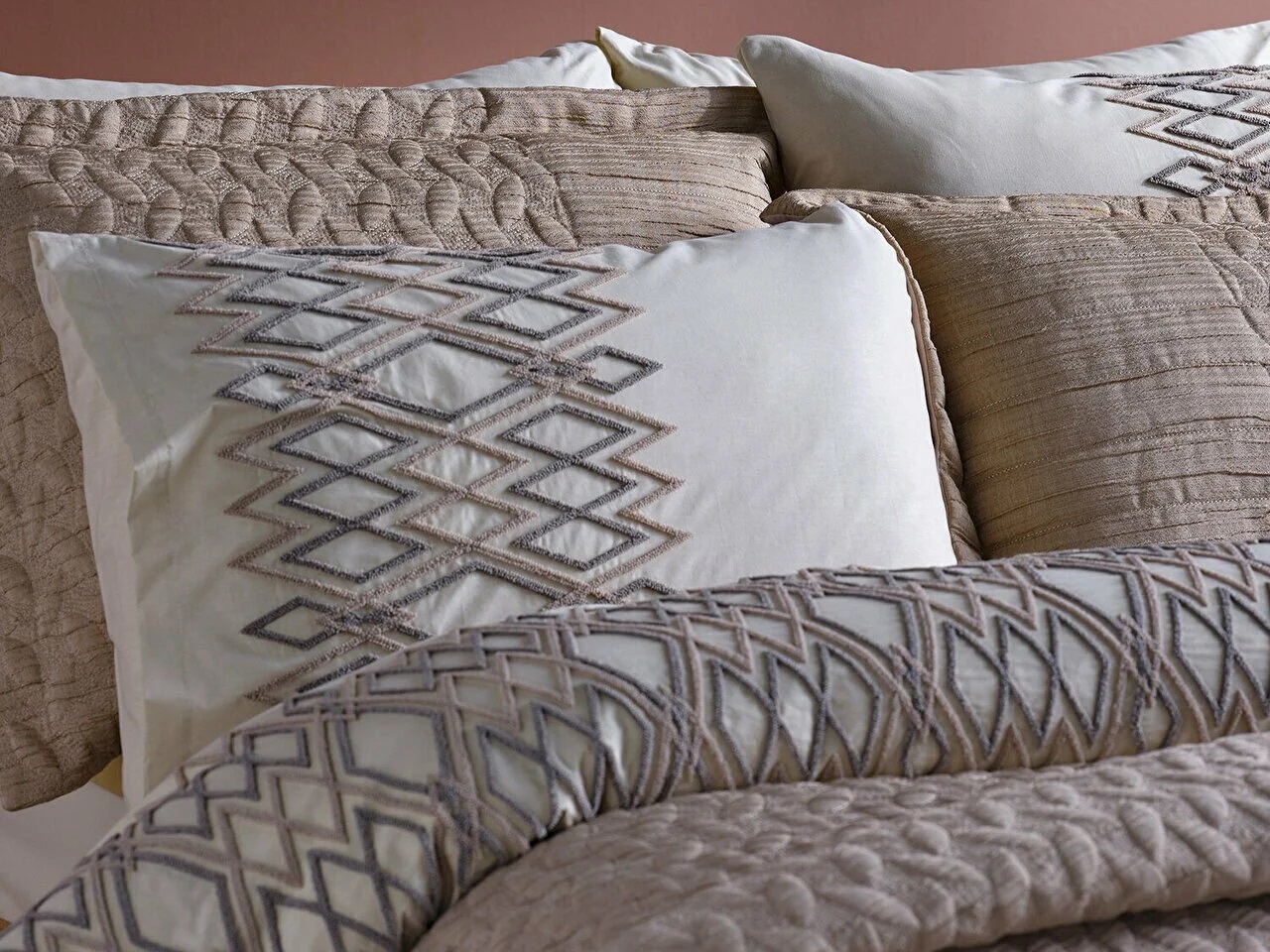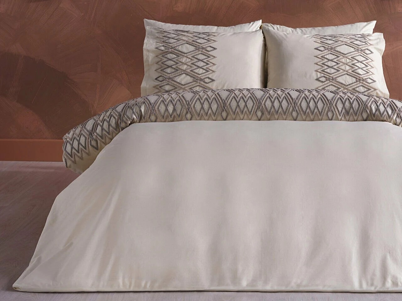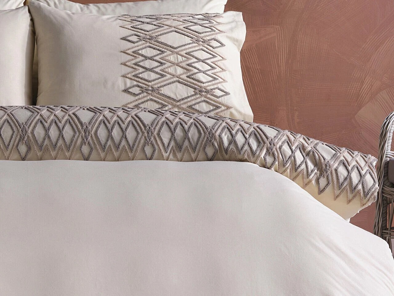 Broderia se face in stil geometric. Broderia perforată oferă un aspect foarte texturat și bogat vizual, făcut din bucle. Conceput în tonuri de bej și maro pe țesătură ecru, setul cu broderie Capitol va fi indispensabil clienților noștri care nu renunță la detaliile de broderie din dormitoarele lor.