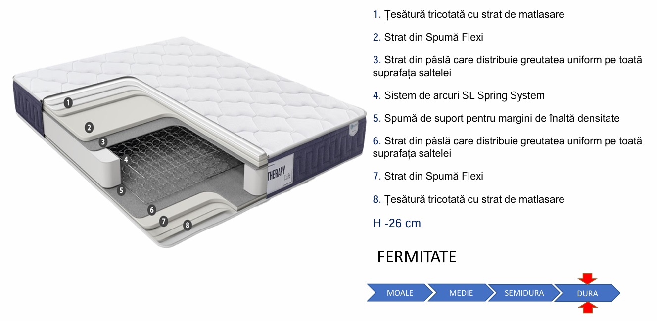 Therapy Life, un model nou de saltea cu două alternative de culoare: bleumarin și krem-maro. Datorită acestui design, ai posibilitatea să îți alegi culoarea pe care o dorești pentru a se potrivi propriului gust. Caracteristicile interioare ale saltelei, concepută în două alternative de culoare, sunt la fel, fiind doar diferite vizual cu aplicațiile sale de culoare. Salteaua Therapy Life îți va oferi un somn confortabil prin combinarea sistemului de arc SL cu textură exterioară a saltelei moale și respirabilă. Arcurile SL sunt conectate între ele continuu, oferind suport optim corpului la fiecare mișcare. Astfel, ele nu se deformează în timp. Spuma dură de suport pentru margini este folosită pe toată marginea saltelei de jur împrejur. Acestă spumă crește rezistența saltelei prin prevenirea strivirii și prăbușirii. Salteaua Therapy Life este produsă pentru utilizare pe două fețe și are o structură „dură” pe ambele părți. Înălțime 26 cm.