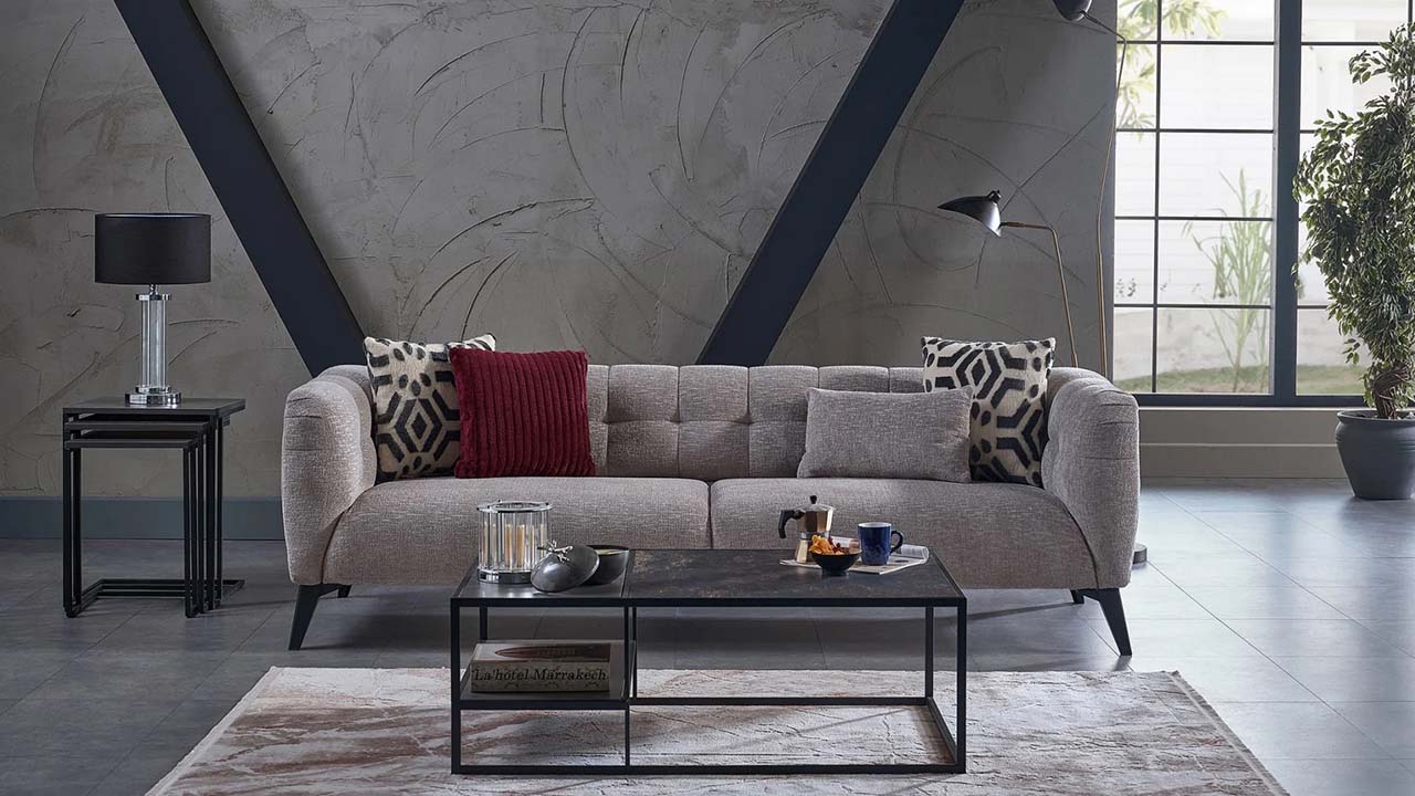 Seturi living Indiana de la Bellona - colțar extensibil Indiana de 239 cm în nuanțe elegant-gri-bej, amplasat într-un living spațios cu design minimalist. Confort, funcționalitate și design contemporan. Cumpără Indiana Set Living în Moldova — livrare în Chișinău și în întreaga țară.
