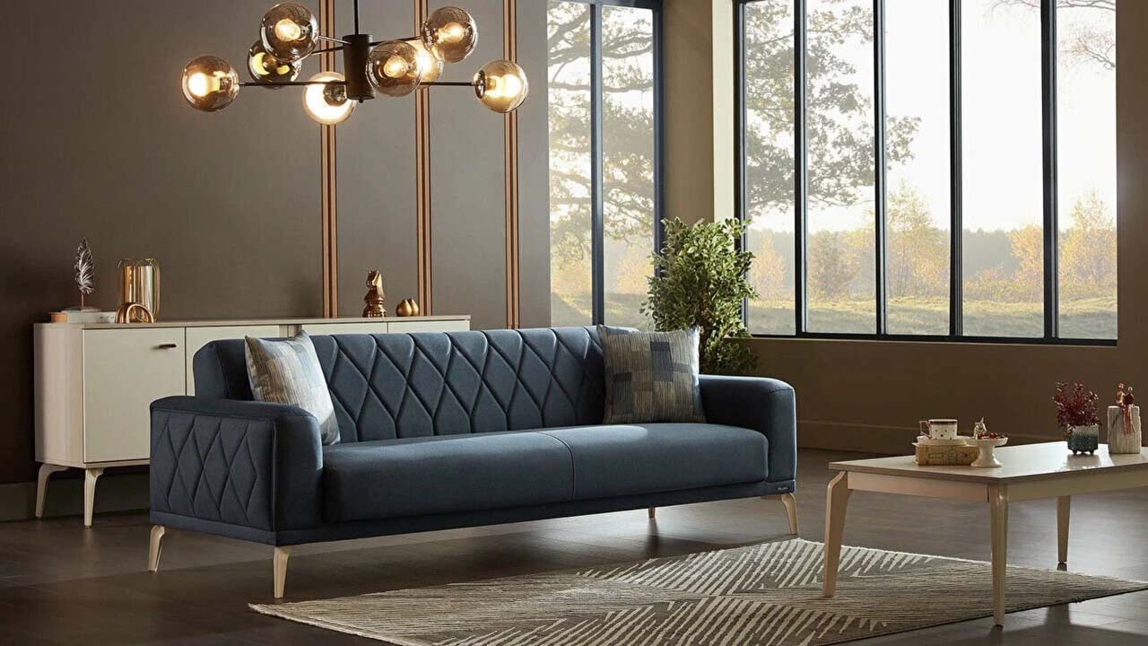 „Set Living Palermo de la Bellona” — set elegant de mobilier tapițat: canapea extensibilă Palermo într-o nuanță profundă de „albastru”, așezată într-un living modern. Confort, eleganță și estetică. Cumpără Palermo Set Living în Moldova — livrare în Chișinău și în toată țara.