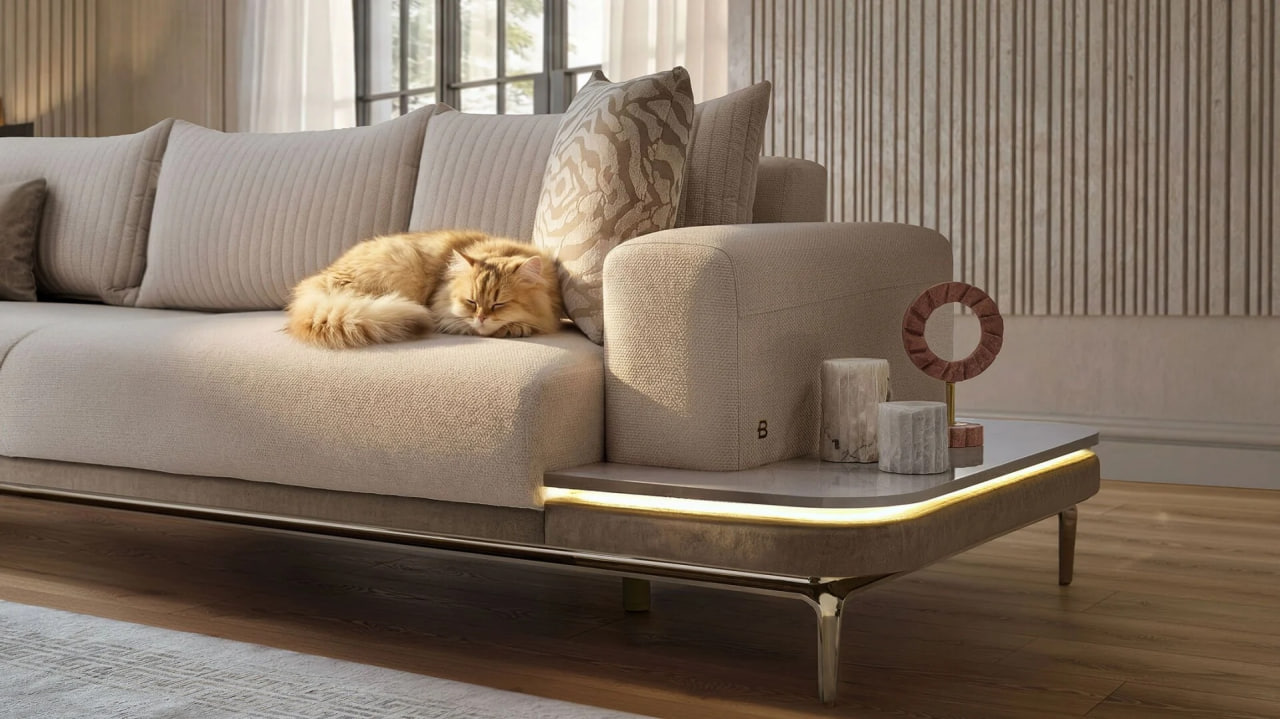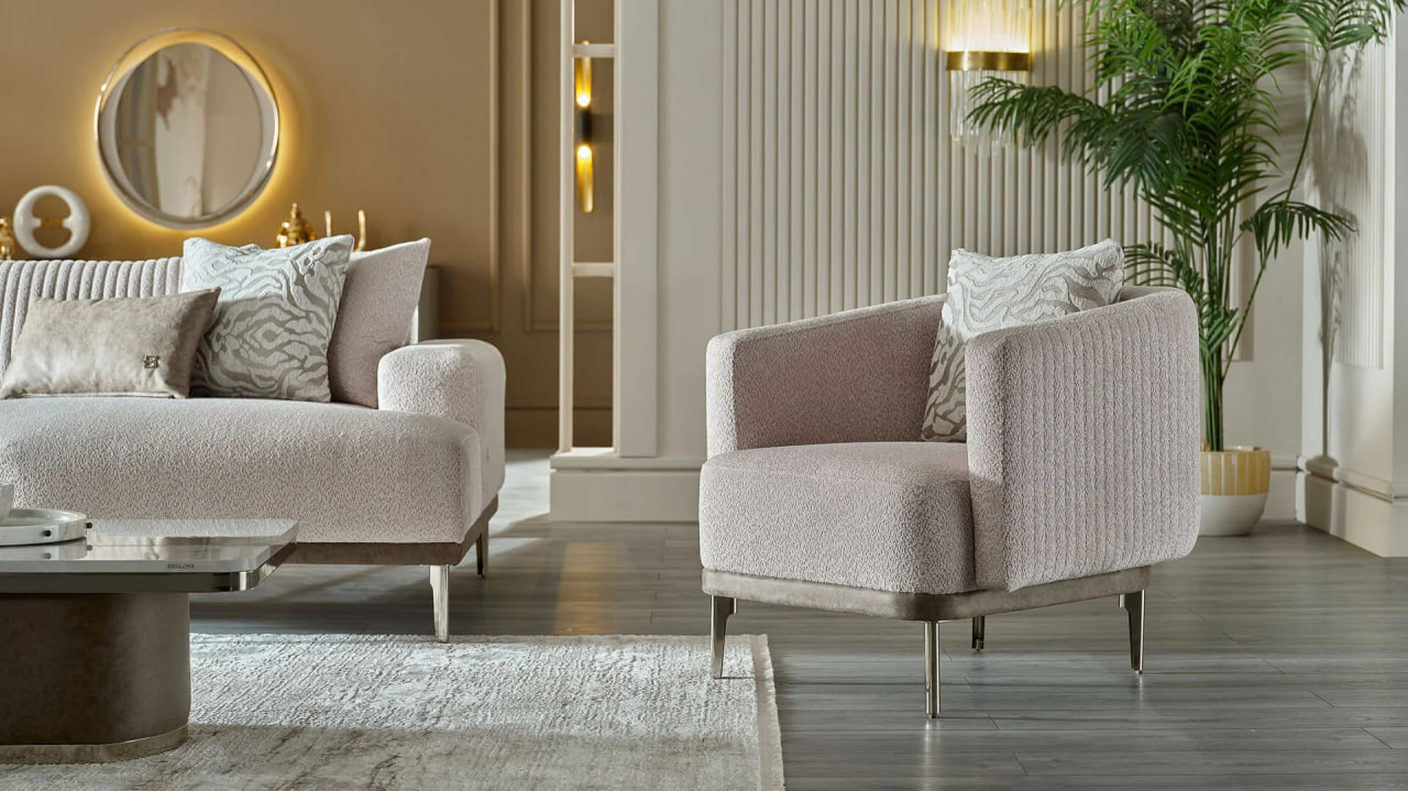 Стильный гостиный гарнитур Estella от Bellona в светлых тонах: элегантный диван с высокими подлокотниками и тонкими металлическими ножками, дополненный креслами, гармонично вписывается в современный интерьер. Купить гарнитур Estella в Молдове — доставка по Кишинёву и всей стране.