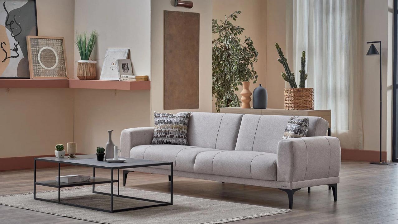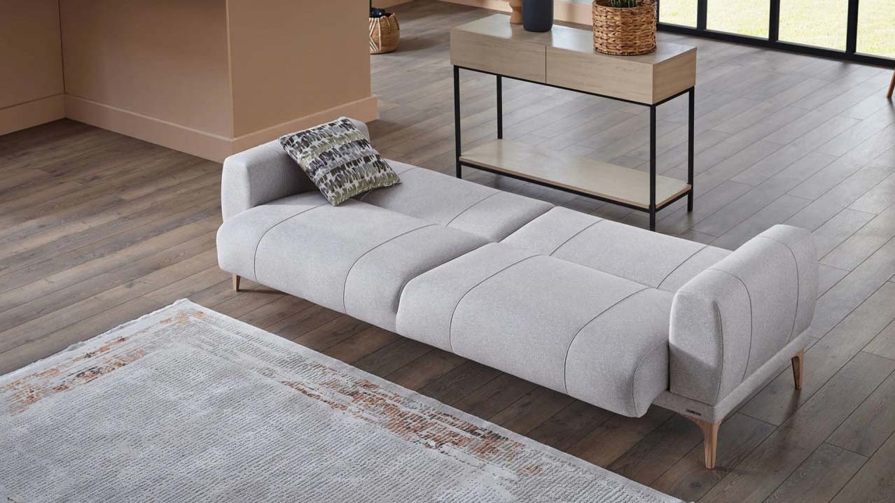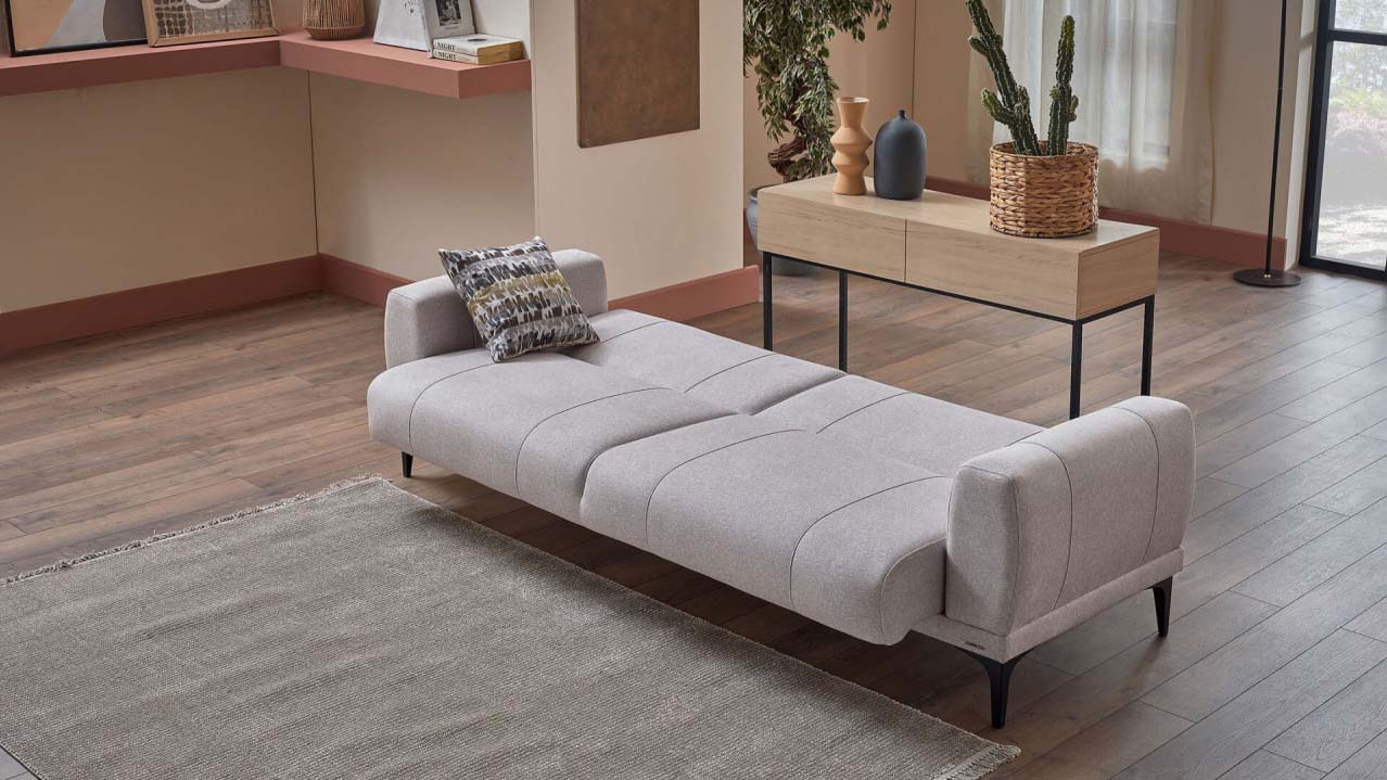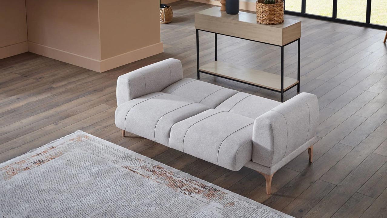 Элегантный раскладной диван Porto длиной 232 см в мягком кремовом цвете. Диван выполнен в современном минималистичном стиле с прямыми лаконичными формами, обшит плотной тканью светлого натурального оттенка. Модель располагается на аккуратных деревянных ножках, создающих ощущение лёгкости и воздушности. Его универсальная нейтральная гамма и компактные габариты гармонично вписываются в интерьер любой гостиной, идеально подходя как для отдыха, так и для комфортного сна.
