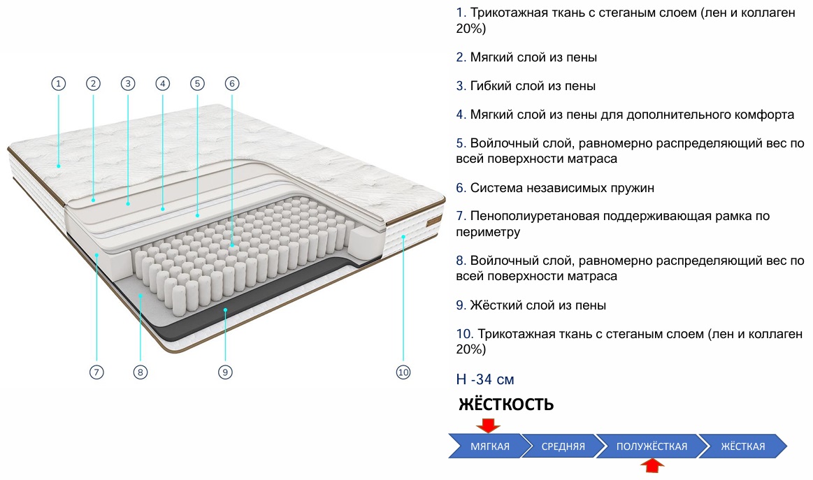 Матрас Kolajen Linen содержит текстильные волокна и белок коллагена, который оказывает благоприятное воздействие для кожи. Содержимое матраса сочетается с белком коллагена, который обеспечивает структурную целостность тканей нашего тела, и системой индивидуальных пружин, разработанной для идеального сна. Эта пружинная система адаптируется к телу человека и равномерно распределяет вес тела на матрасе. Благодаря индивидуальным пружинам повышается комфорт сна, улучшается кровообращение и позвоночник во время сна принимает более здоровую форму.