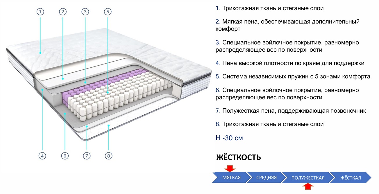 Матрас Soft Selection Pro-5 обеспечивает комфортный сон благодаря инновационному пенопластовому слою Softfoam, который обеспечивает мягкость и чрезвычайно приятное ощущение на ощупь. Индивидуальная пружинная система с 5 зонами комфорта — это превосходная пружинная технология, предлагающая потребителю ряд преимуществ в долгосрочной перспективе, например, поддержка мышечной системы и позвоночника. Матрас можно использовать с обеих сторон: одна с мягким слоем, другая с полужестким слоем.