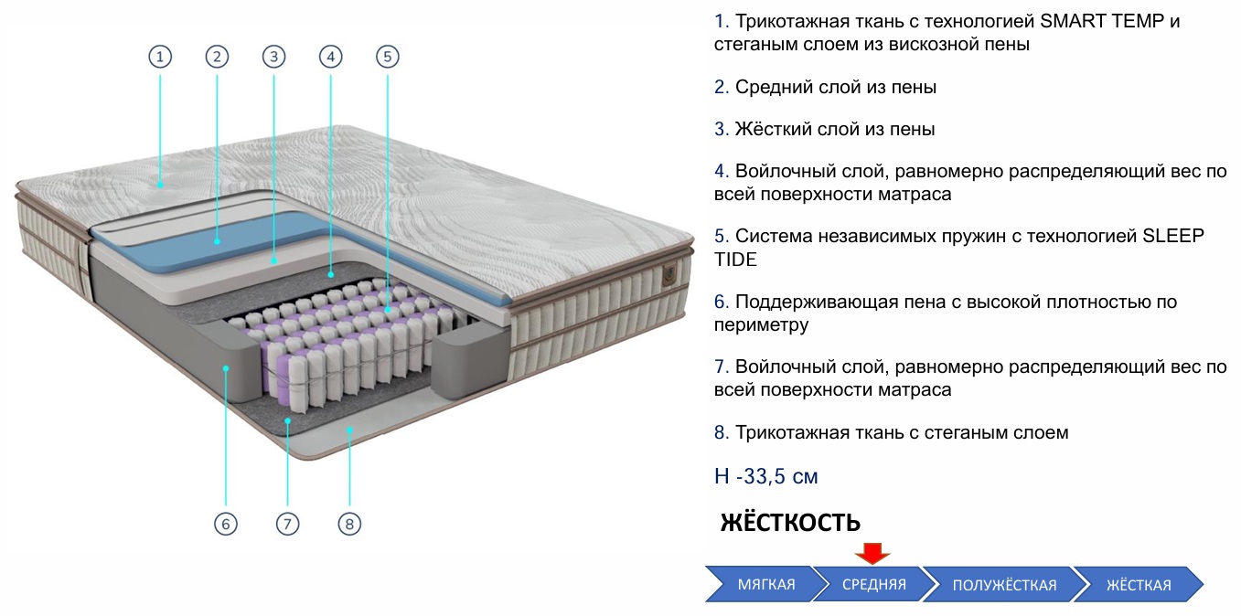 Матрас Bella Master Sleep был разработан для удовлетворения потребностей пользователей в комфорте, с использованием самых инновационных технологий. Тканевая технология Smart Temp, используемая в этой модели дышащего матраса, помогает эффективно управлять влажностью, обеспечивая идеальный тепловой комфорт во время сна. В данной модели матраса использована пружинная технология Sleep Tide Bag. Пружины индивидуально упакованы и расположены рядами на разной высоте, что увеличивает циркуляцию воздуха внутри матраса и продлевает срок его службы. Эта пружинная система обнимает тело благодаря своей изогнутой конструкции с максимальной гибкостью, обеспечивая минимальное давление. Естественные движения во время сна поддерживаются с максимальным комфортом, что позволяет мышцам полностью расслабиться.