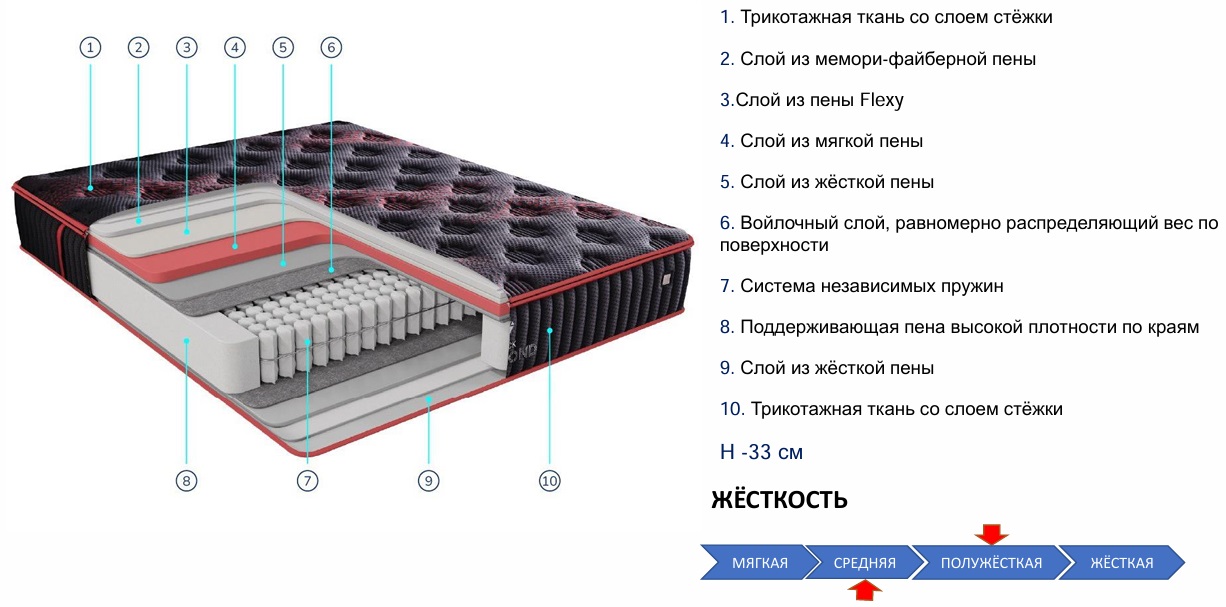 Матрас Black Diamond предлагает уникальные ощущения от сна в любом положении благодаря комфорту, обеспечиваемому пеной Visco в стеганом слое и индивидуальной пружинной системе, используемой внутри матраса. Эта пружинная система обеспечивает превосходный уровень гибкости и оптимальную поддержку тела во время сна. Вращения во время сна не влияют на партнеров, поскольку благодаря этой пружинной системе движения не ощущаются, а это качество, которое позволяет нам наслаждаться здоровым и глубоким сном. Матрас имеет съемный верх на молнии, который можно использовать с обеих сторон матраса. Пена Visco в топпере принимает форму тела, поддерживает позвоночник в каждой точке и обеспечивает уникальный комфортный и приятный сон. Также благодаря этому топперу матрас долгое время сохраняется чистым и дезинфицируется.