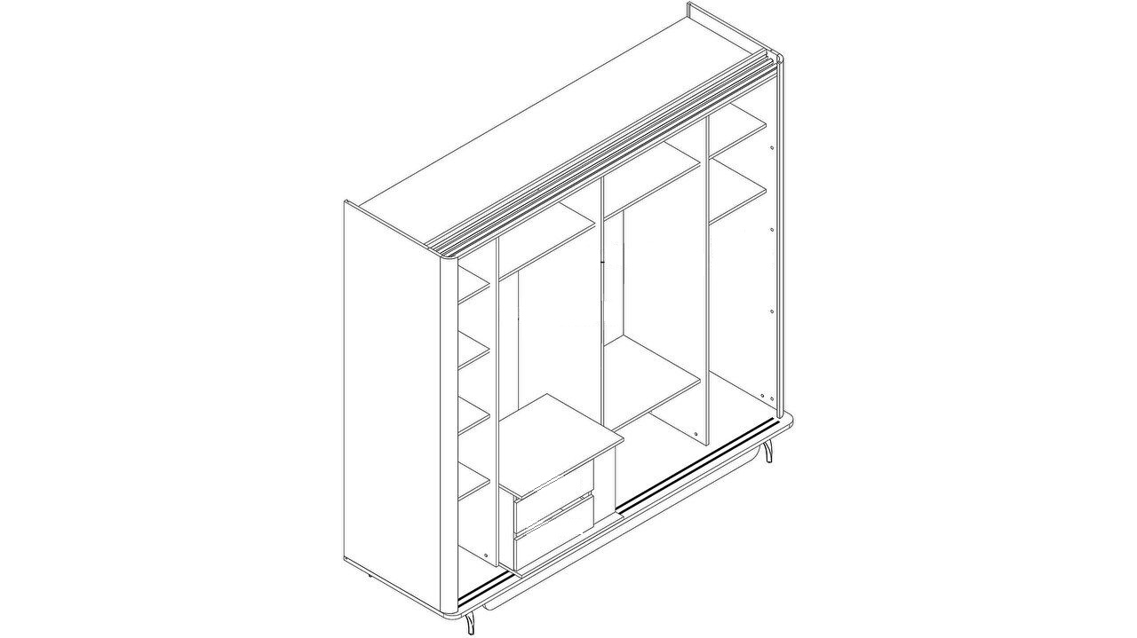 Модель оснащена раздвижными дверями с механизмом плавного закрывания (soft-close), обеспечивающим тихий и плавный доступ к внутреннему пространству. Продуманная внутренняя организация включает полки, 2 выдвижных ящика и штанги для одежды, что позволяет удобно хранить вещи и поддерживать идеальный порядок каждый день.