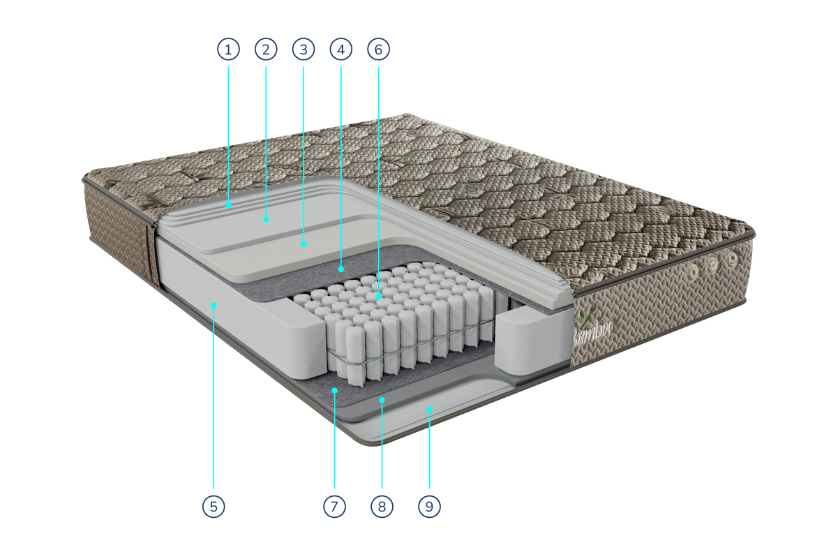 Матрас Dream Bamboo представляет собой объединение инновационных идей для обеспечения комфортного и здорового сна. Ткань бамбукового матраса приятная на ощупь, помогает телу дышать, впитывая влагу и быстро высыхая, что обеспечивает дополнительный комфорт. Технология индивидуальных пружин, присутствующая в матрасе Dream Bamboo, делает сон качественным, в то же время вместе с гибкой пеной также помогает обеспечить идеальный комфорт. Матрас Dream Bamboo также оснащен топпером на молнии, который можно прикрепить к обеим поверхностям и при необходимости снять для чистки. Матрас оснащен поддерживающей пеной по краям, имеет 2 уровня жесткости и высоту 33 см.