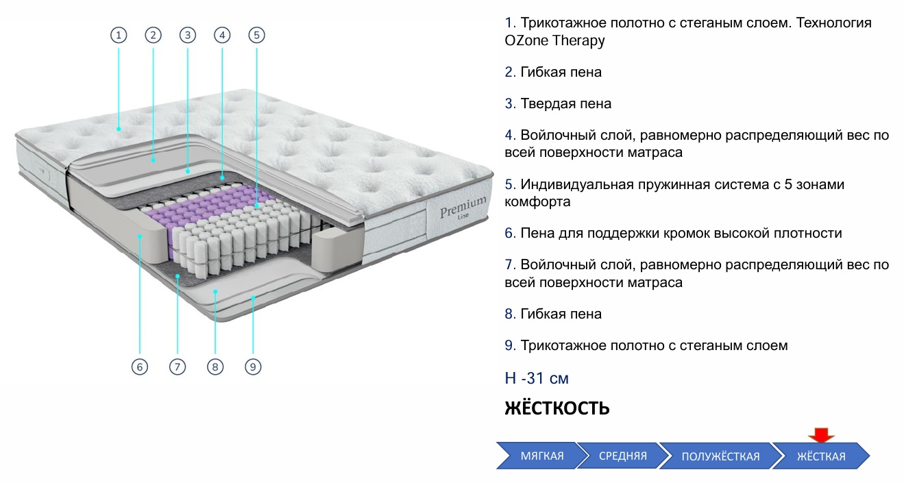 Матрас Premium Line предназначен для тех, кто ищет высококачественный сон с особым акцентом на чистоту и свежесть спального пространства. Если вы хотите матрас, который выделяется уникальной технологией — такой как интегрированная в ткань терапия озоном — и при этом обеспечивает ортопедический комфорт независимых пружин, то Premium Line — ваш выбор.