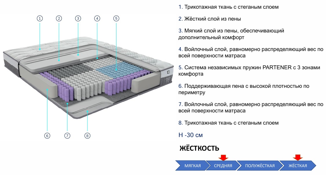 Hybrid Sleep – инновационный матрас 2024 года, основная особенность которого – две разные жесткости на одной поверхности. Правая сторона обеспечивает твердую поверхность, а левая сторона обеспечивает мягкую поверхность. Таким образом, матрас Hybrid Sleep станет идеальной моделью для партнеров, которым нужны поверхности разной жесткости, гармонично сочетая отдельные пружины PARTNER с 3 зонами комфорта справа и 3 зонами комфорта слева и слоями пены, расположенными слой за слоем, чтобы обеспечить комфорт, желаемый каждым отдельным партнером.