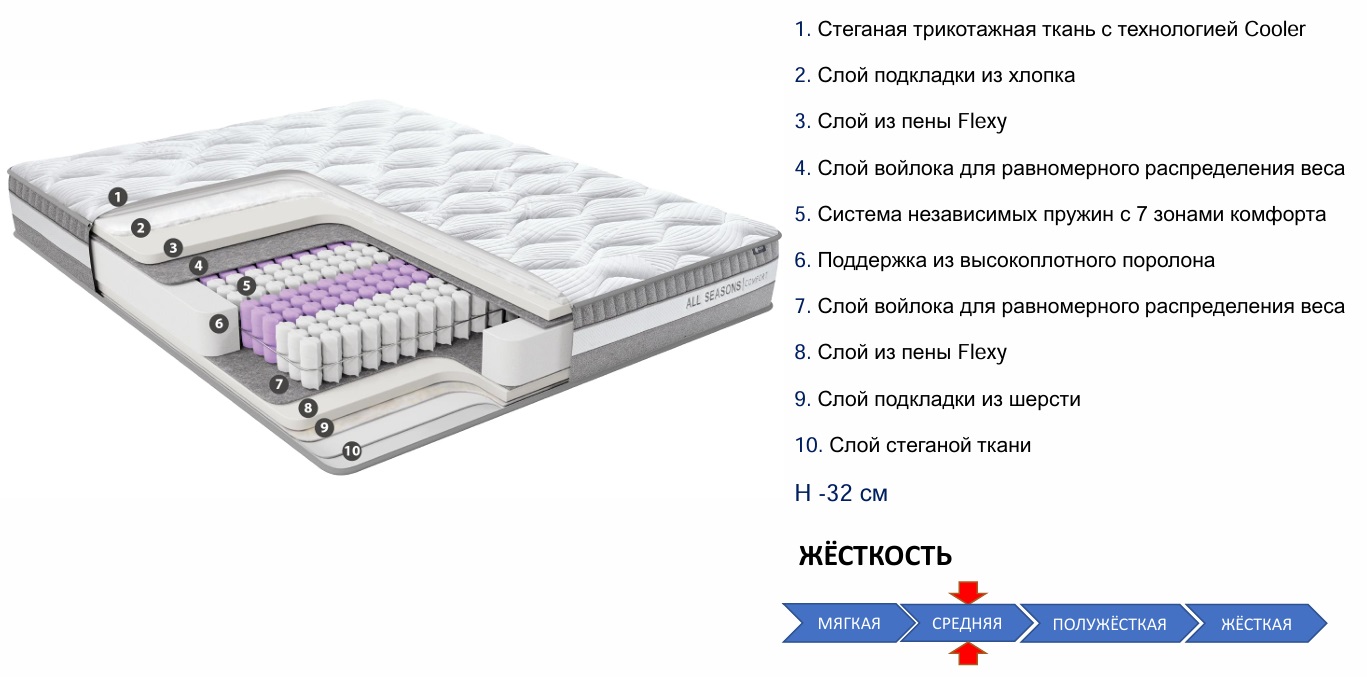Матрас All Seasons Comfort – комфорт в любое время года. Эта модель отличается универсальностью и подходит как для лета, так и для зимы, обеспечивая оптимальные условия для сна в любое время года.