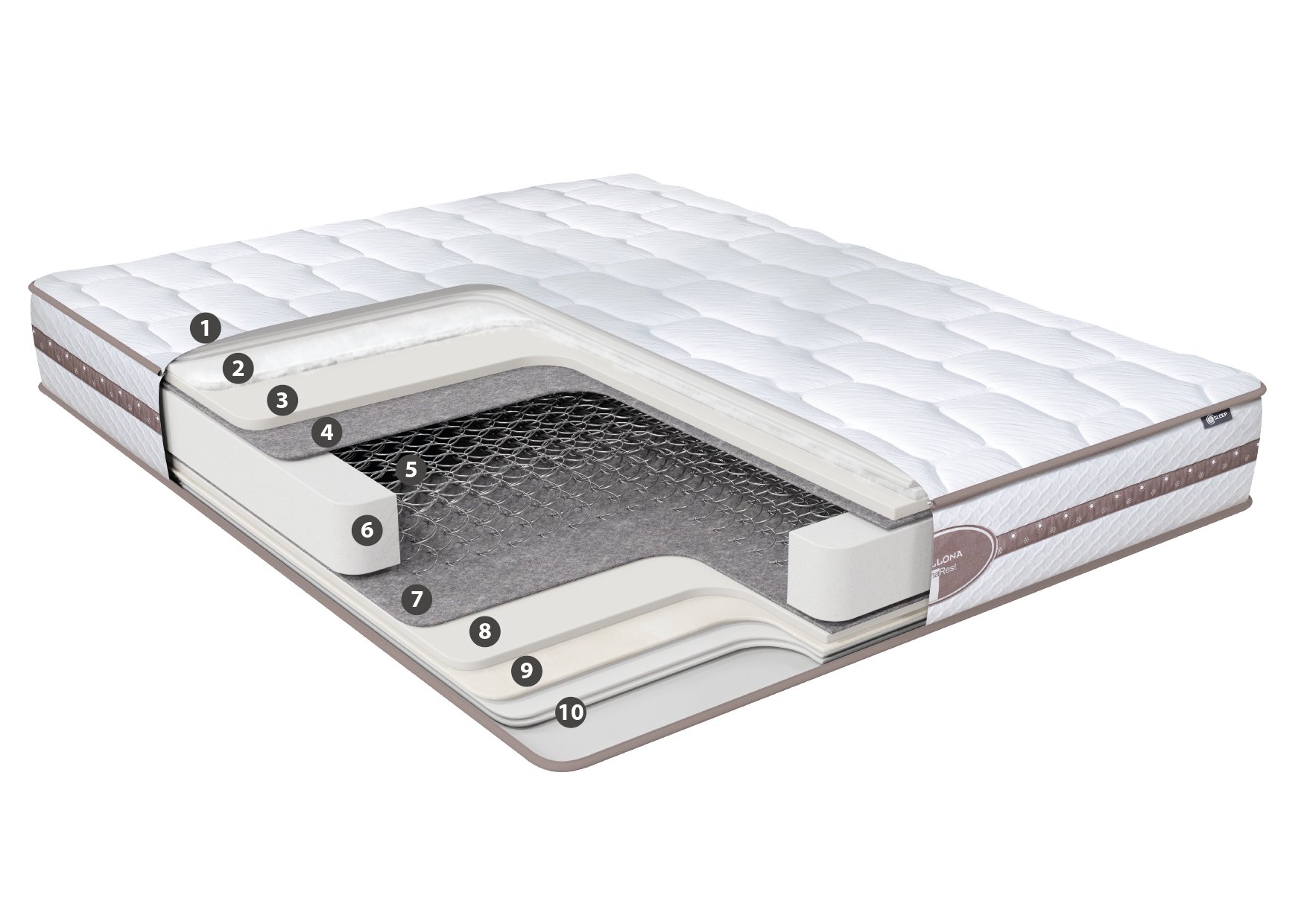 С эстетической точки зрения ClimaRest впечатляет изысканными деталями, такими как декоративные полосы и фирменные нашивки в элегантных оттенках норки. Боковая полоса в этом цвете четко обозначает сезонные стороны: изображение солнца сверху указывает на летнюю поверхность, а снежинки снизу — на зимнюю. Это позволяет легко определить подходящую сторону матраса в зависимости от времени года. Кроме того, простежка на летней и зимней поверхностях различается, подчеркивая внимание к деталям и функциональную адаптацию матраса.