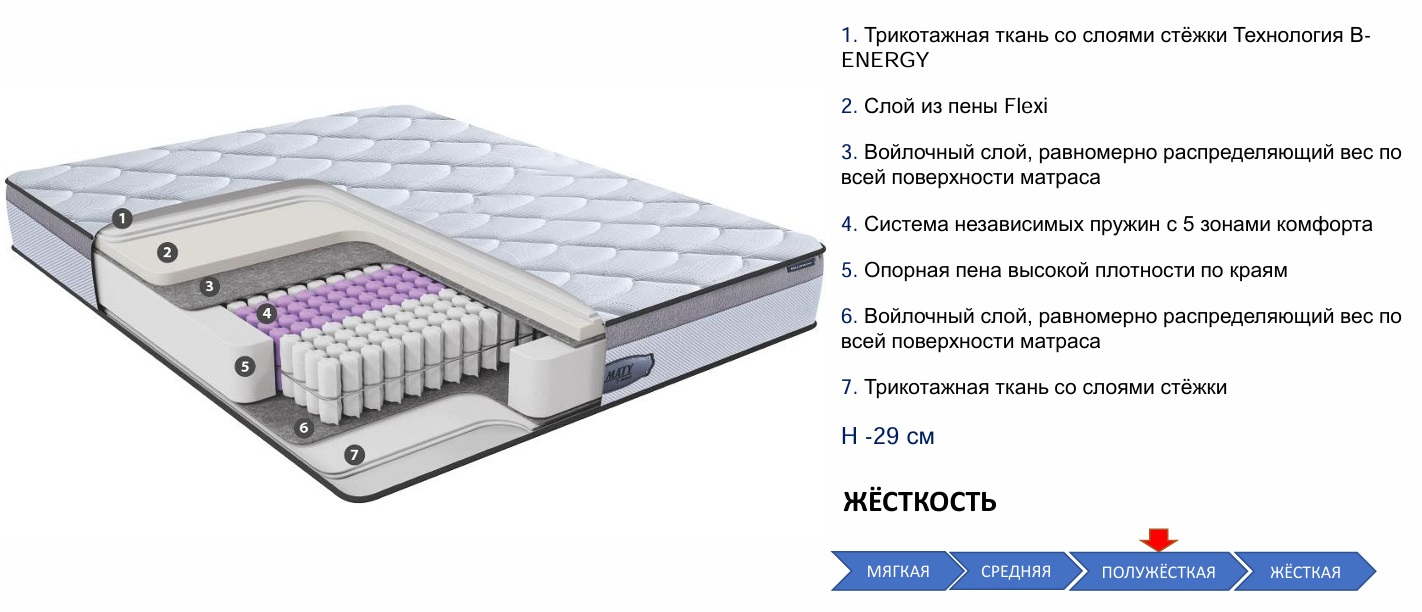 Ортопедический матрас Maty 5 Zone обеспечивает качественный сон благодаря системе независимых пружин, разделённых на 5 зон комфорта, идеально адаптирующихся к контурам тела. С высотой 29 см он обеспечивает оптимальную поддержку каждой части тела, способствуя снятию точек давления.